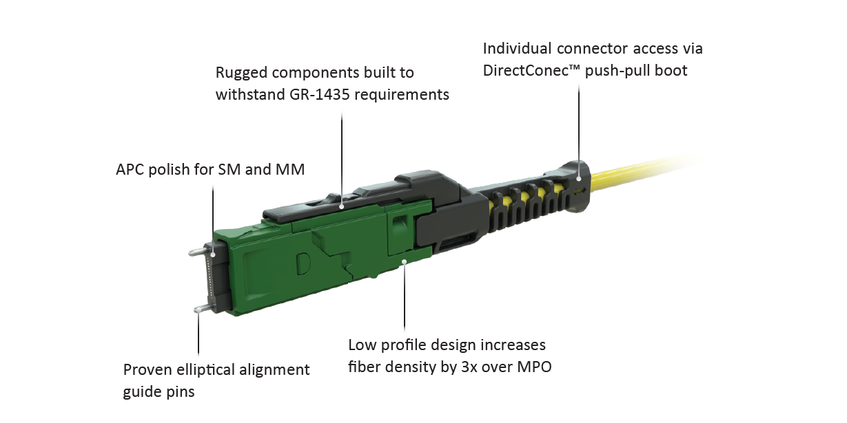 MMC® connector assemblies feature a miniaturized multi-fiber interface with precision-guided ferrules and robust mechanical retention, ensuring repeatable performance even in ultra-dense installations.